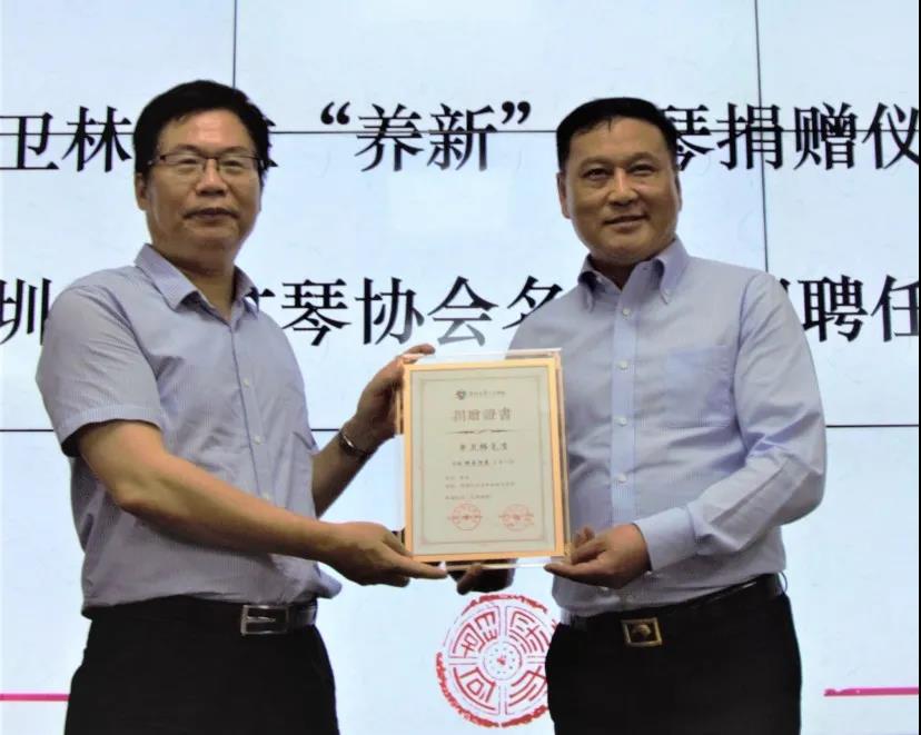 马老师与单先生提及要在深圳大学创办古琴协会的想法,单先生毅然支持,并表示要给当时还未诞生的协会捐赠一床亲手斫制的古琴。十年时光荏苒,古琴已不再是那初只会被文人雅士所提及的乐器,在新时代传承中华传统文化的大背景下,在人文学院特色班国学精英班八年教学基础上,深圳大学古琴协会正式成立,单先生鼎力支持,慷慨捐琴。这天晚上,和往常一样庄重典雅的国学院见证多年挚友紧紧握手、对琴抒怀的一幕幕,一床名为“养新”的古琴也从此与古琴协会缔结姻缘。