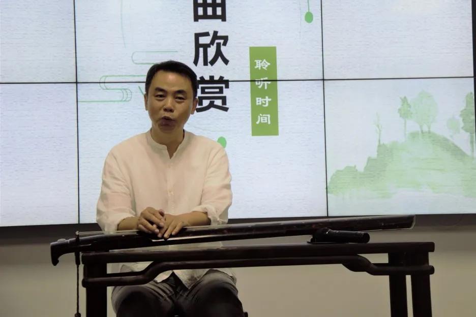 《秋江夜泊》引出了古琴作为“器”的所蕴含的传统文化以及古琴的文化地位。周代乐教、孔子与琴瑟的典故,都表明古琴是君子修身的必备之器,而且古琴还有“琴德”一说,要做到十四宜弹,十四不弹。之后,马老师为大家梳理了古琴历史脉络及发展:从神农氏“削桐为琴、绳丝为弦”到2008年北京奥运会开幕式陈雷激先生独奏“太古遗音”,古琴虽有盛有衰,却始终带着一股君子之气流传到了现在。马老师介绍了古琴的两种琴谱:文字谱和减字谱;古琴十大流派如浙派、梅庵派、广陵派、岭南派等。